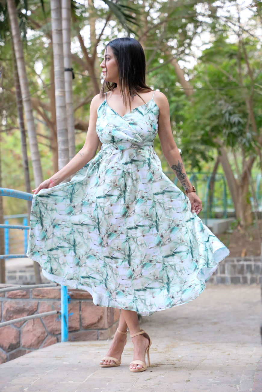 Midi dress with a surplice neckline, thin straps, A-line flarred, invisible side zip.